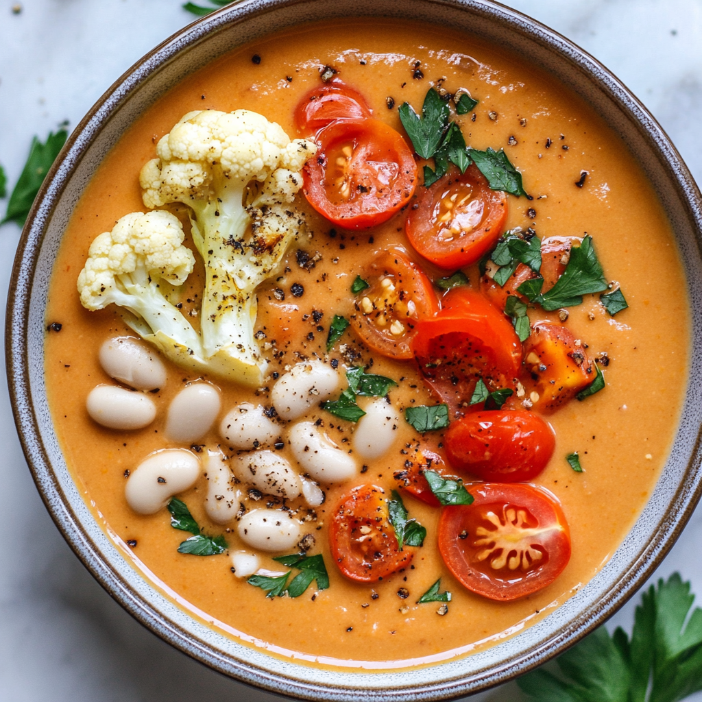 Creamy Vegan Tomato and Cauliflower Bisque is a heartwarming soup that combines the richness of roasted tomatoes and cauliflower with the smoothness of white beans. This nutrient-dense dish is perfect for both cozy lunches and elegant dinners. With simple, wholesome ingredients, it’s easy to whip up in no time. The hidden vegetables provide depth of flavor without overwhelming your palate, making this bisque a comforting favorite for all ages. Enjoy it on its own or paired with crusty bread or a fresh salad for a complete meal.
